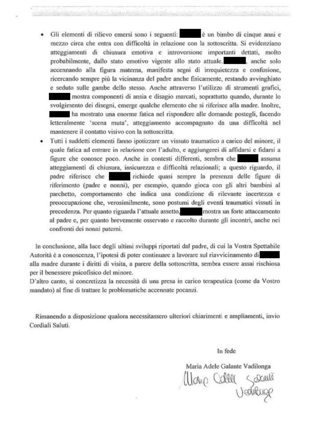 Kiedy przeczytaliśmy to, co przygotowała psycholog Maria Adele Galante Vadilonga, było to dla nas kolejny wstrząs. Bo skala braku profesjonalizmu przy tak ważnej sprawie dziecka poraża! (dokument dołączamy do niniejszego tekstu).